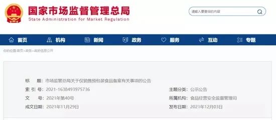 2021年12月3日,國家市場監(jiān)督管理總局發(fā)布了《關(guān)于僅銷售預(yù)包裝食品備案有關(guān)事項的公告》(國家市場監(jiān)督管理總局公告2021年第40號,以下簡稱《公告》)。 本次市場監(jiān)管總局關(guān)于僅銷售預(yù)包裝食品備案有關(guān)事項的公告,為貫徹落實2021年4月2…